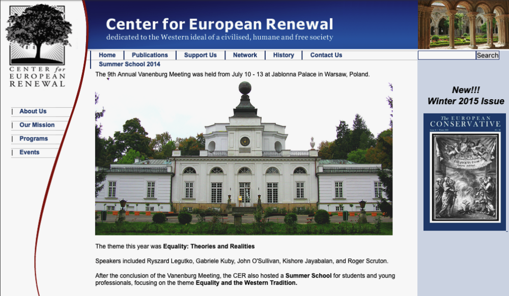 - 46“The theme this year was Equality: Theories and Realities. Speakers included Ryszard Legutko, Gabriele Kuby, John O'Sullivan, Kishore Jayabalan, and Roger Scruton.” See: “9th Annual Vanenburg Meeting: Equality: Theories and Realities,” Center for European Renewal, archived copy from May 5, 2015, https://web.archive.org/web/20150505052832/http://www.europeanrenewal.org/main/page.php?page_id=33.