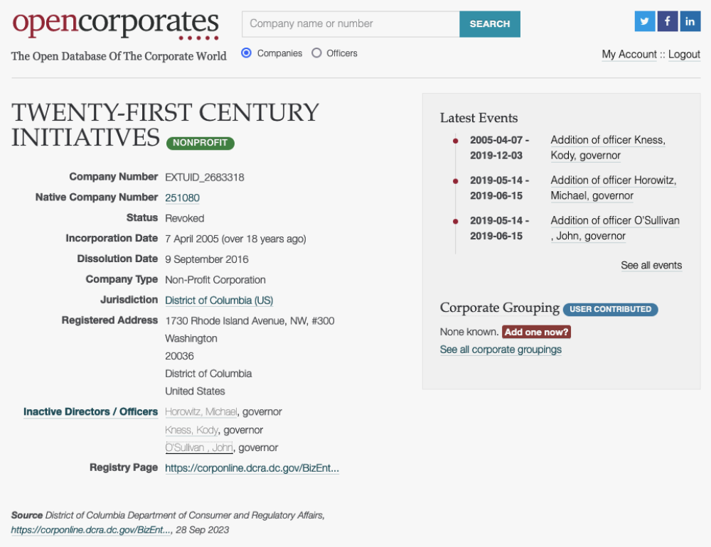 O'Sullivan has been quoted as the co-founder and director of the nonprofit Twenty-First Century Initiatives (TFCI) in various online biographies, however, the footprint of the organization is meager.31 According to data present at Open Corporates, the organization was founded in 2005 and was dissolved in 2016. However, there was a change of governors in 2019, three years after the TFCI had dissolved, including John O'Sullivan and Michael Horowitz as governors. The organization has notably received money from the Lynde and Harry Bradley Foundation, Inc. in 2014 to the tune of $25,000.32 Thus, it may be speculated that it is rather a financial vehicle to receive funds than an active organization.